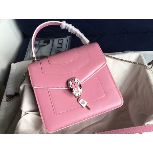 Плоска капак чанта " Serpenti Forever " в розова телешка кожа. Месингов обков със светло златисто покритие и изкушаващо затваряне на змийска глава в лъскав изумруден емайл, с очи в оникс. Модел с горна дръжка с три клина, с регулируема и подвижна верига във формата на змийско тяло и кожена каишка. Вътрешен метален етикет с логото на Bvlgari и джобно огледало.