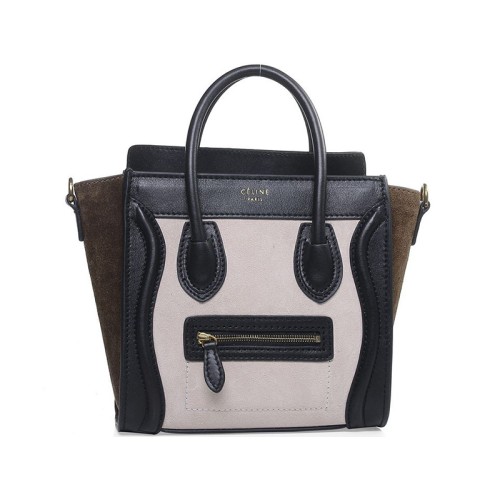 Мини чанта Celine Luggage Tote от телешка кожа в светло бежово/велурено маслинено сиво