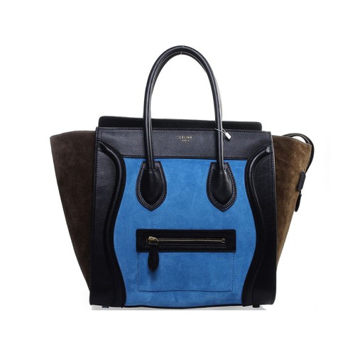 Чанта Celine Luggage Medium Tote от телешка кожа, черно/велурено светло синьо