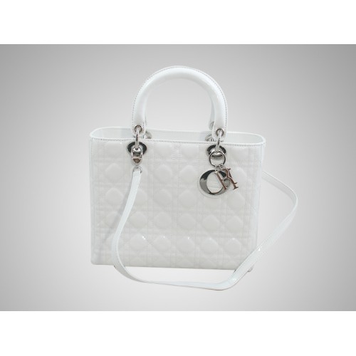 Класическият блясък произтича от тази сладко изтънчена дамска чанта. Вдъхновена от ретро квилинг с канаж на Dior, геометрична решетка е зашита върху еластична агнешка кожа, допълнително подчертана от хардуер, завършен със скъпоценни камъни. С дребни кожени дръжки, подвижна презрамка и искрящи талисмани Lady Dior.