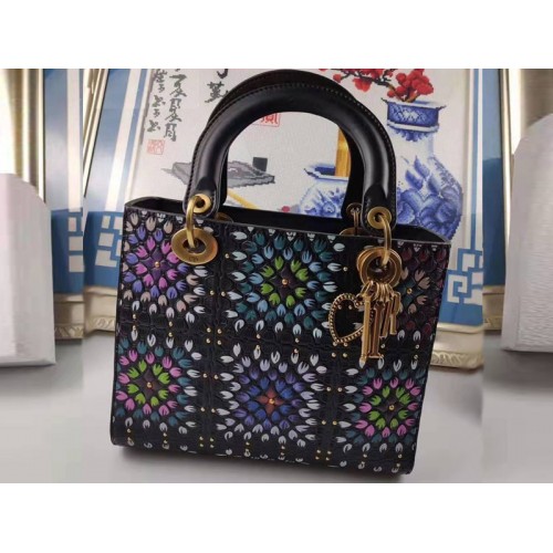 Dior Lady Dior в черно, релефна телешка кожа с ръчно рисуване