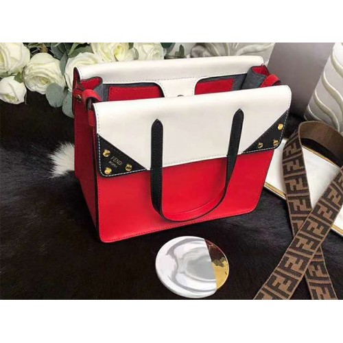 Средна чанта. Двойната дръжка, с капак, който се сгъва отстрани, ви позволява да носите чантата на ръка или да я носите на рамото или напречното тяло благодарение на подвижните презрамки. Подплата с плосък джоб. Изработен от микс от бежова и тъмно синя телешка кожа. Декориран с микро плоски шипове. Презрамка с панделка с мотив FF. Метални изделия със златно покритие.