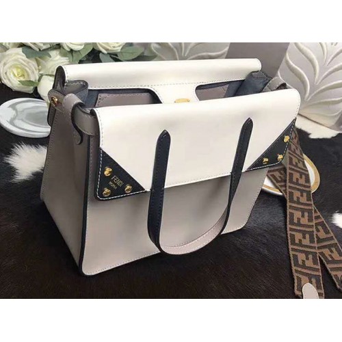 Средна чанта. Двойната дръжка, с капак, който се сгъва отстрани, ви позволява да носите чантата на ръка или да я носите на рамото или напречното тяло благодарение на подвижните презрамки. Подплата с плосък джоб. Изработен от микс от бежова и тъмно синя телешка кожа. Декориран с микро плоски шипове. Презрамка с панделка с мотив FF. Метални изделия със златно покритие.