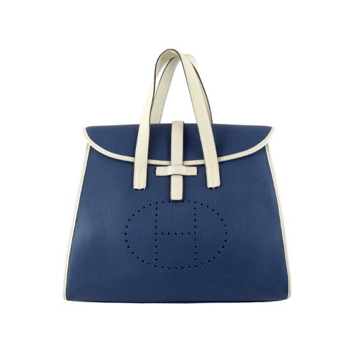 Hermes 08c чанта с клапа в синьо с почти бяла кожена тапицерия