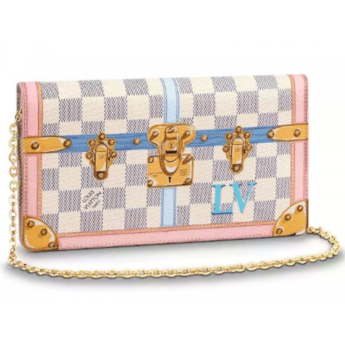 Съединителят Pochette Weekend в лятно платно Damier Azur препраща към наследството от пътуването на Louis Vuitton с trompe-l'œil детайли, напомнящи за емблематичните куфари. Стилен и универсален, той може да се трансформира в малка чанта за рамо благодарение на подвижната си верига. Това специално издание принадлежи към колекцията аксесоари и кожени изделия Trunk Summer 2018.