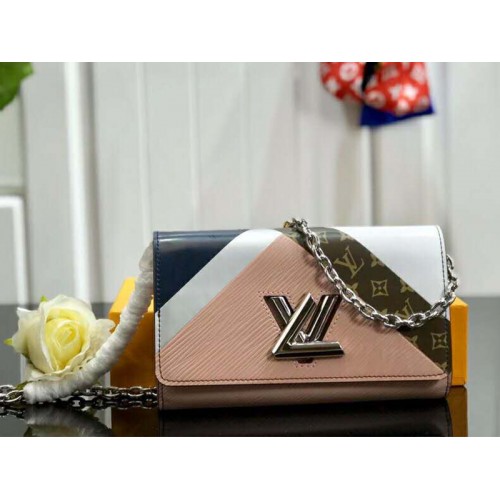 Портфейлът с верига Twist получава смел нов облик за анимацията Twist Graphic Tape. Блокове от цветна кожа са съпоставени с лента с модел Monogram благодарение на уникалните техники за обработка на кожа. Този портфейл, който може да се носи и като малка чанта за през рамо, включва емблематичното LV въртящо се заключване на линията Twist.