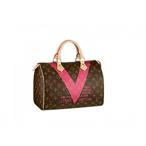 The Speedy 30 Monogram V е хитра, непринудена интерпретация на емблематичния Monogram и стилен V. Класически избор за ден и нощ, вдъхновен от " на Maison;Volez, Voguez, Voyagez" реклами от 1960-те.